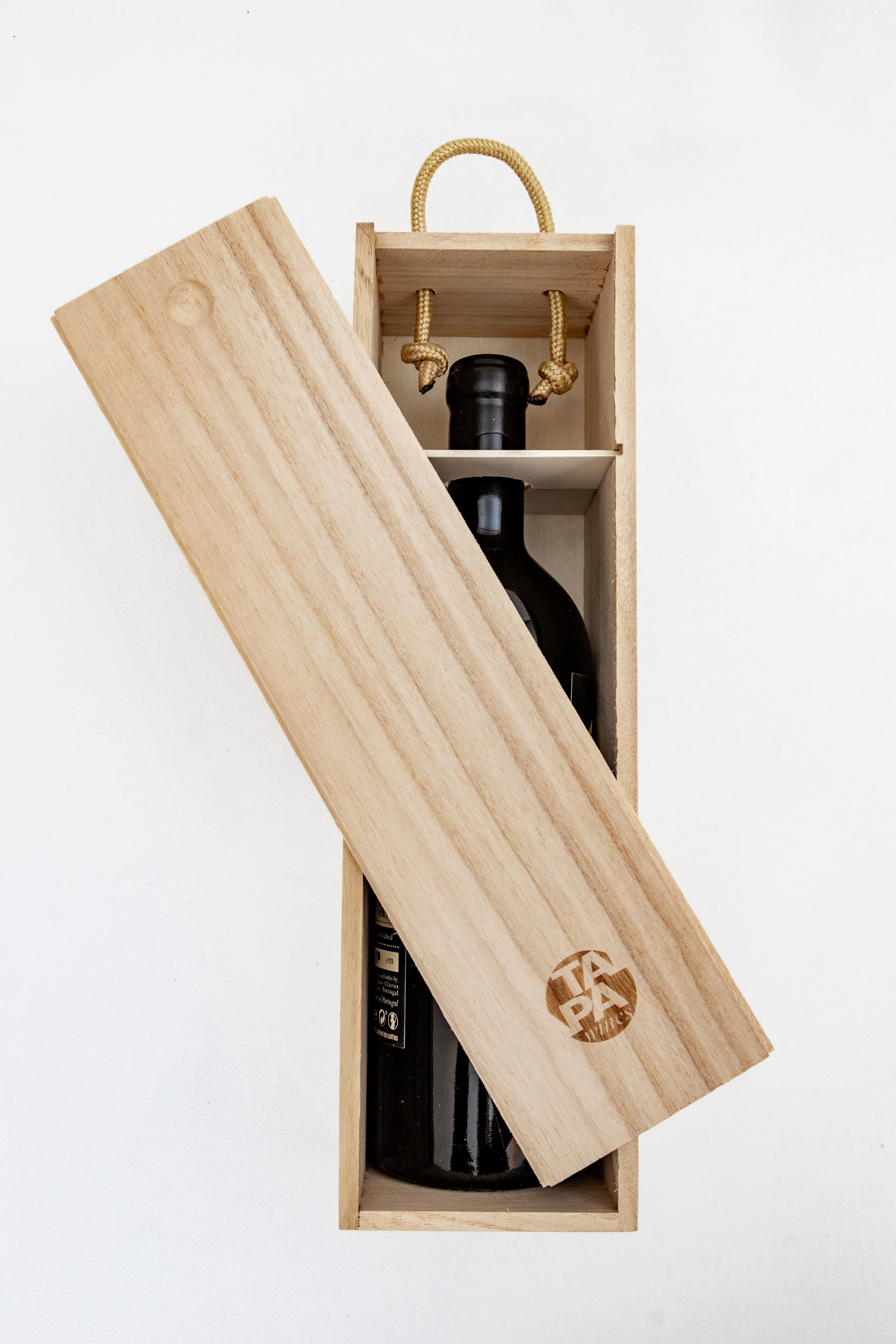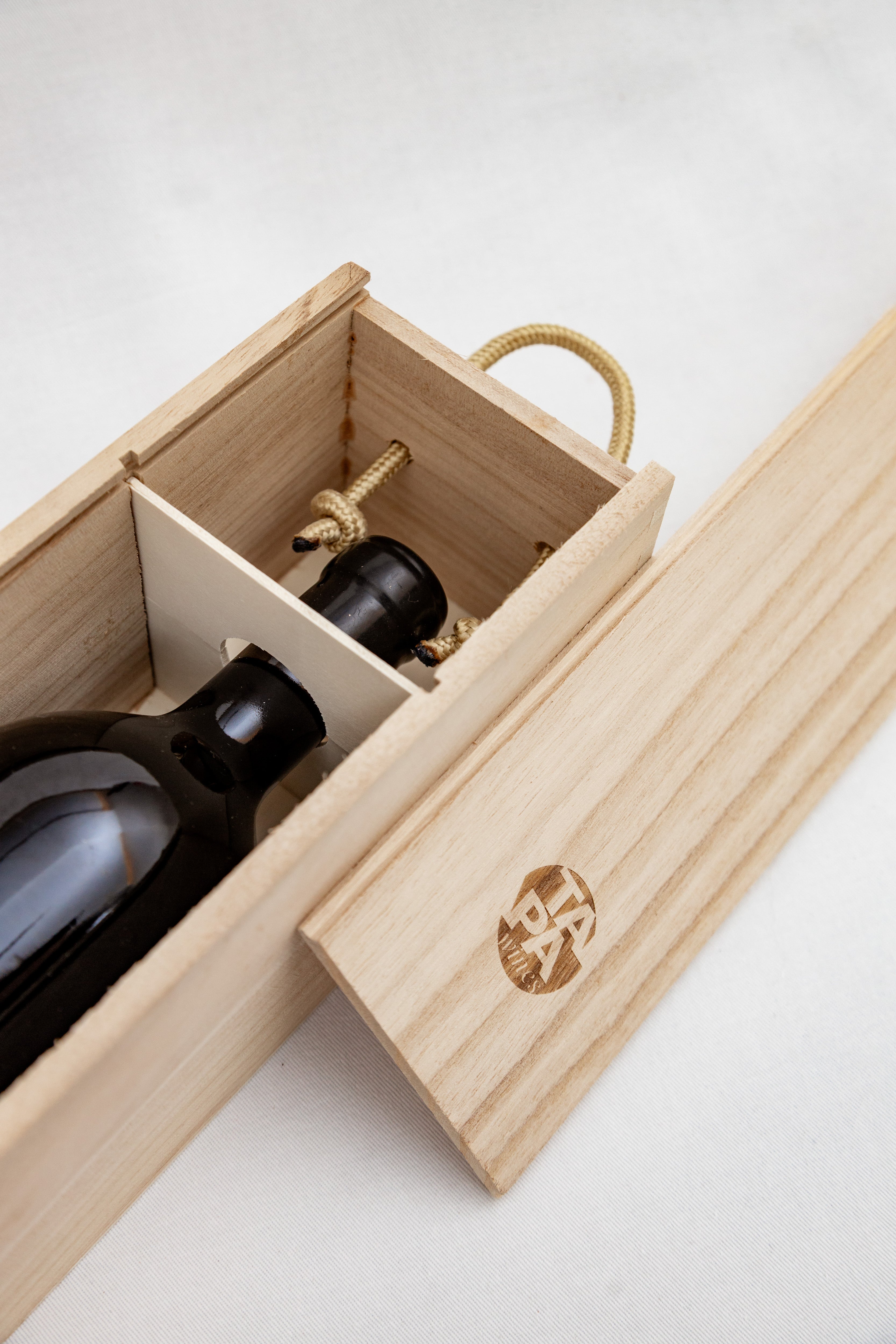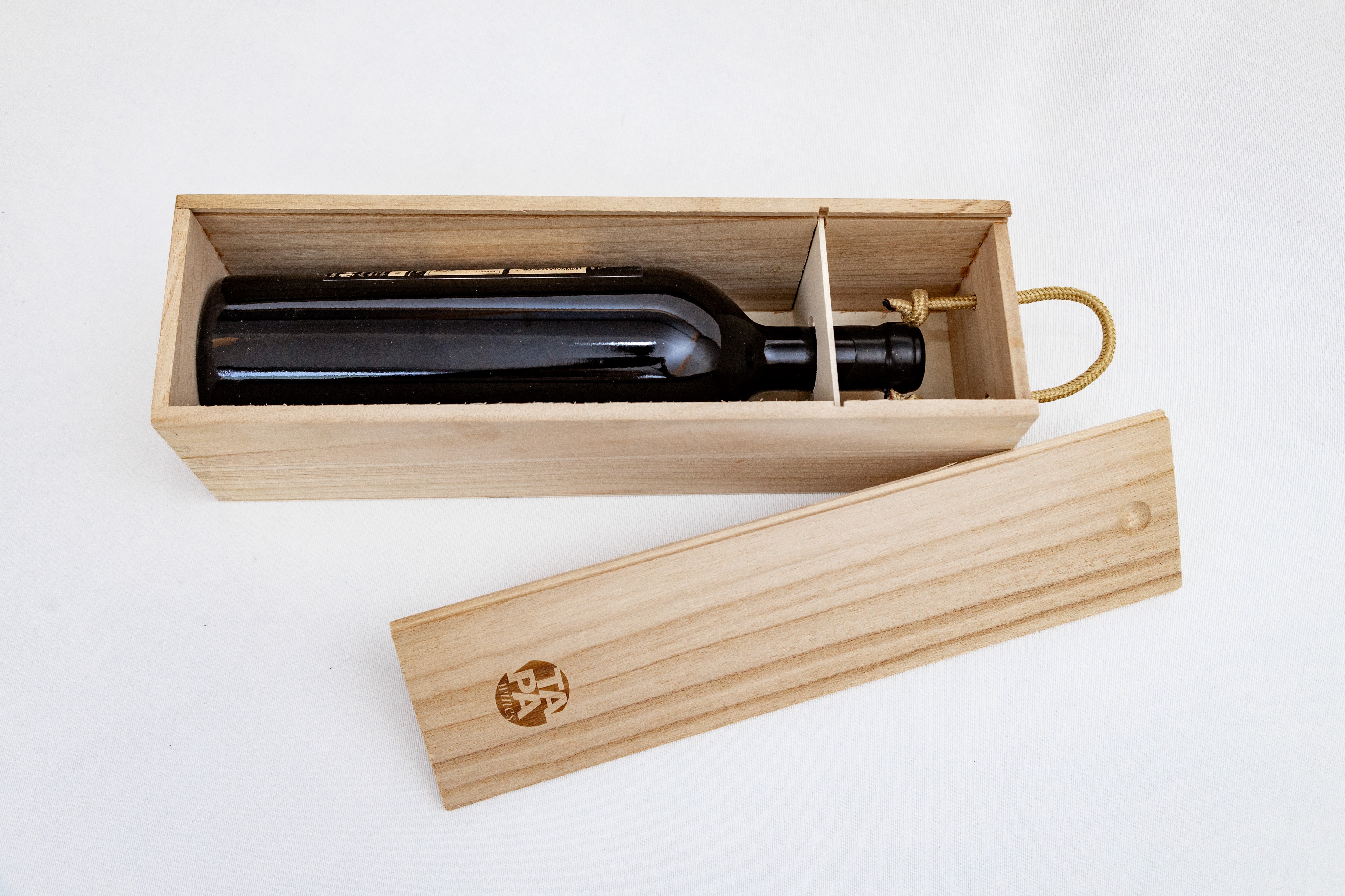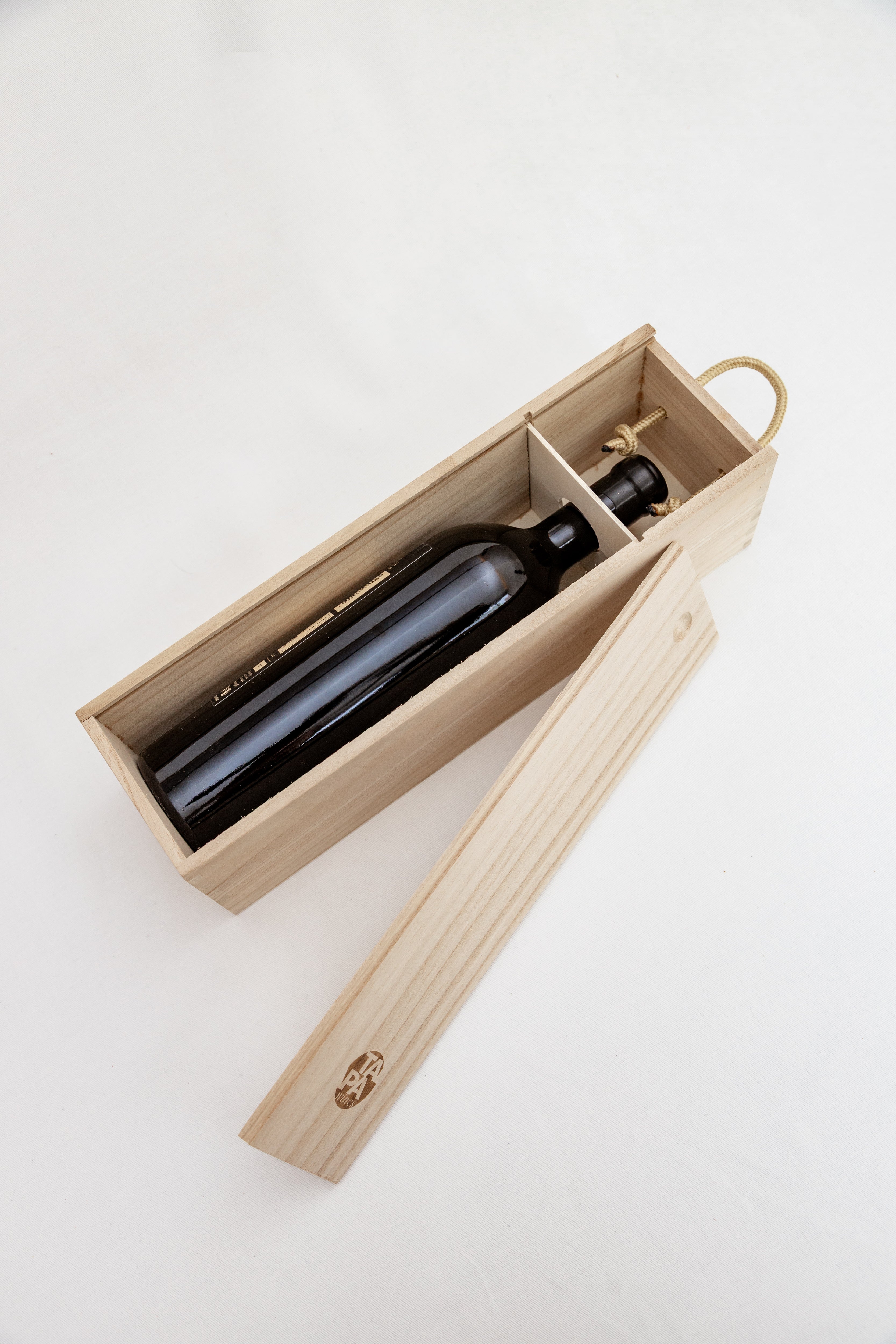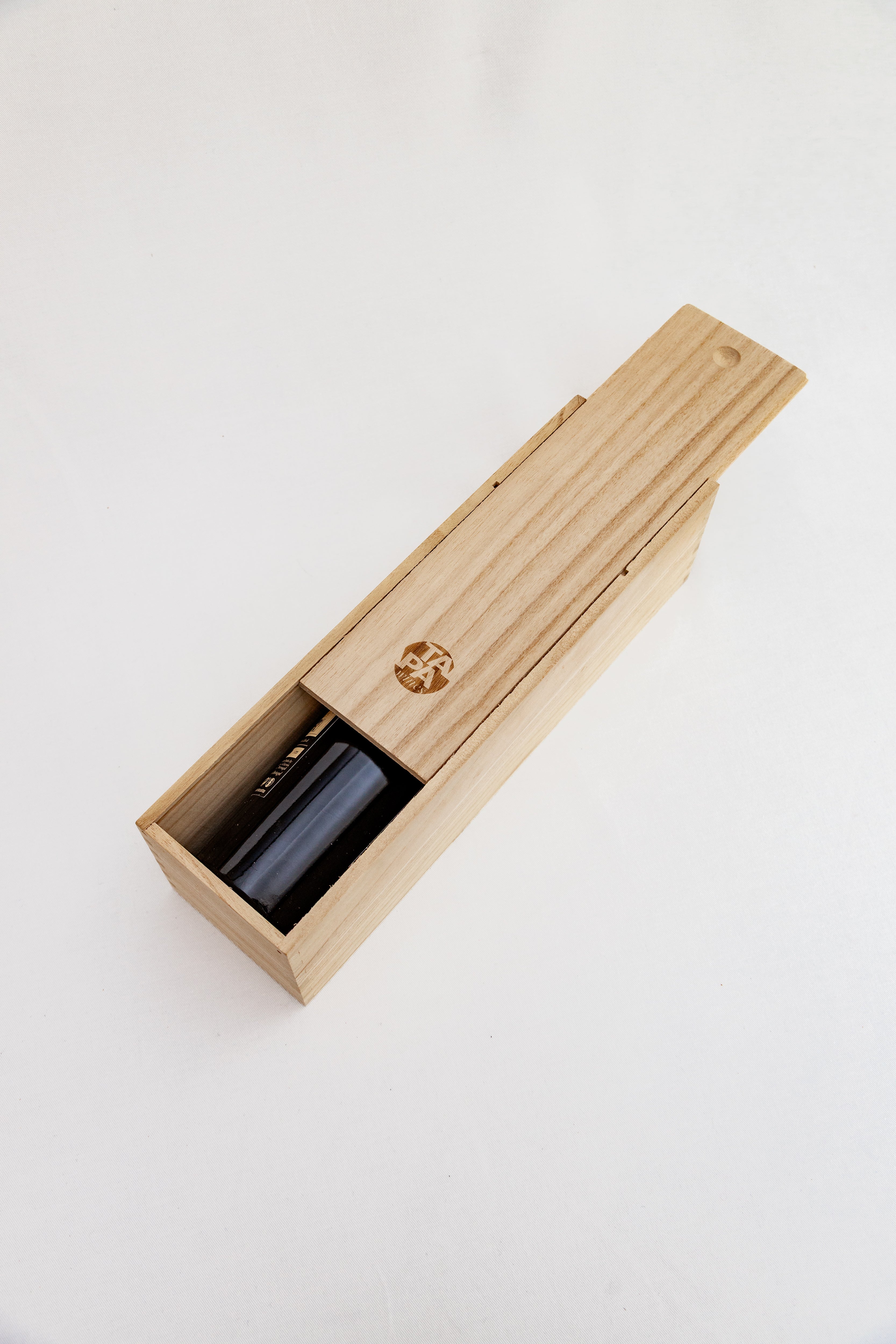 Inspirada no ambiente das caves e na tradição do envelhecimento em barricas, a nossa caixa de madeira clássica, com o logótipo discreto da Tapa Wines, oferece a proteção ideal e versatilidade de uso após o consumo. Em conjunto com o vinho Invincible nº 2, este conjunto forma o presente perfeito, unindo utilidade e sofisticação.